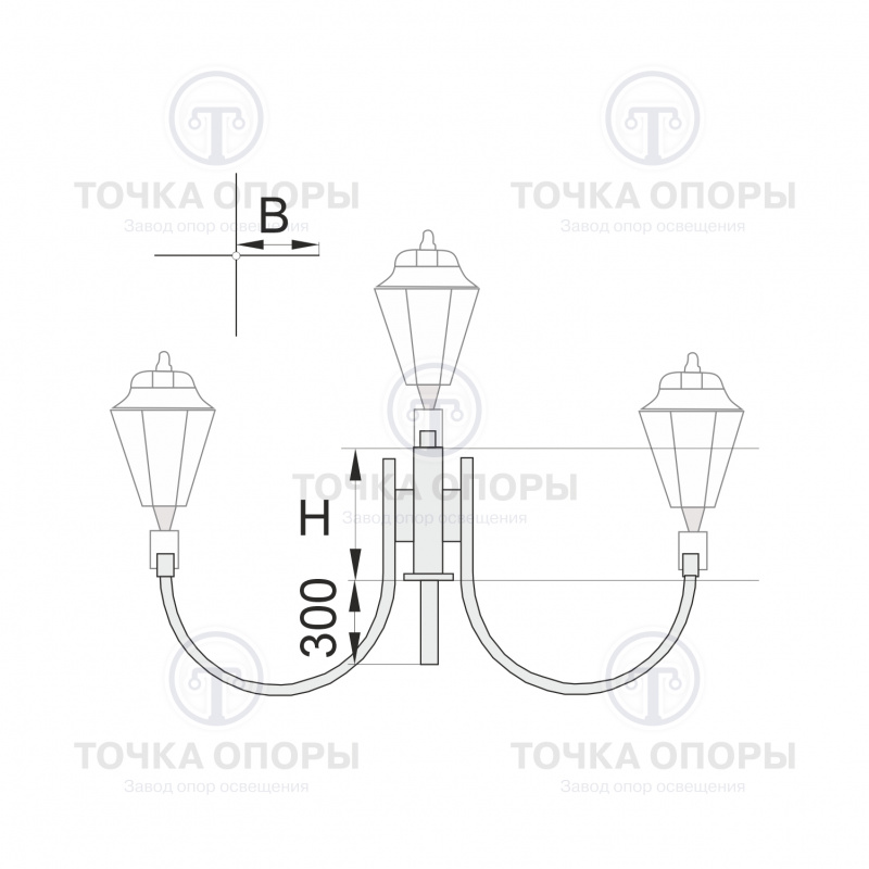 В отличие от консольных кронштейнов, рожки которых предполагают направление освещения вниз, световые приборы на торшерных кронштейнах направлены вертикально вверх. Угол разворота между рожками составляет 90°. Такой вариант востребован для комплектации декоративных опор. Для торшерных пятирожковых кронштейнов могут использоваться парковые светильники Пушкин-эконом, Пушкин-люкс, Шар, Прогресс.