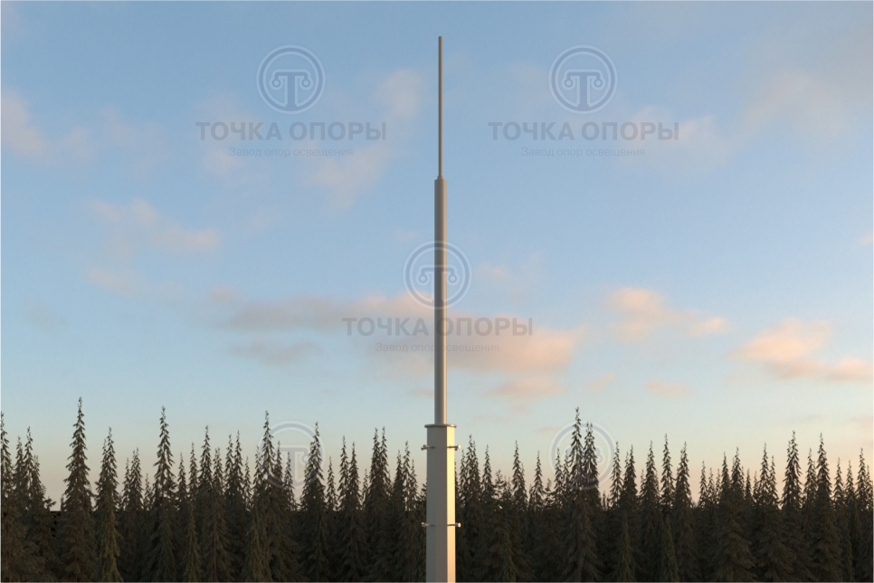Молниеотвод (громоотвод) МОГК, как правило, изготавливается на основе несиловой опоры ОГК, к которой крепится молниеприемник – стальной молниеотводный шпиль от 1 до 5 метров. Возможно изготовление молниеотвода МОГК на базе высокомачтовой опоры.