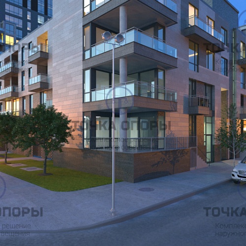 Полный комплект для организации наружного освещения, помимо опоры, включает закладную деталь, метизы (идут в комплекте), цоколь (несет декоративную функцию, не обязателен к установке), кронштейн и светильники.