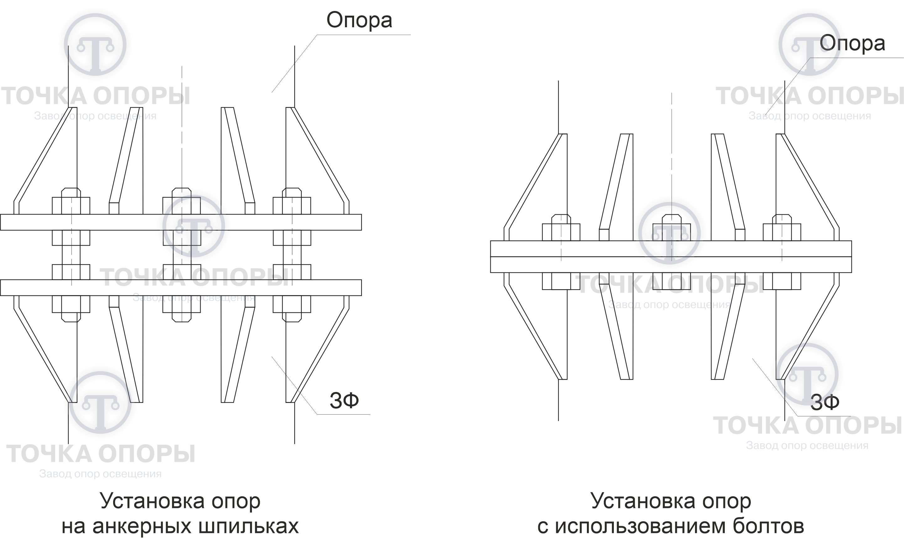 В зависимости от особенности грунта для монтажа фланцевых опор применяются прямые, выносные или консольные